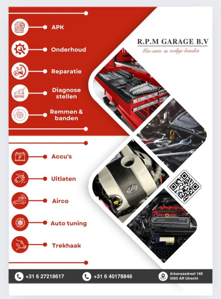 Bij RPM Garage BV bieden we deskundige reparatiediensten voor alle merken en modellen auto's. Onze gecertificeerde monteurs repareren motoren, remmen, elektronica, uitlaatsystemen, en ophangingen met hoogwaardige onderdelen en de nieuwste diagnoseapparatuur. We houden u op de hoogte van de voortgang en kosten, zodat u snel en veilig weer de weg op kunt. Uw tevredenheid en veiligheid staan bij ons voorop.